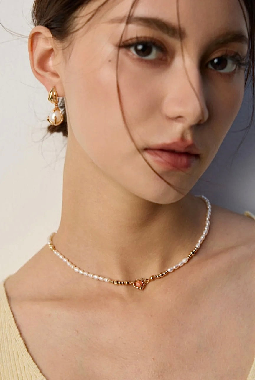 Introducing the Blushing Dawn, a captivating necklace that elegantly combines the timeless allure of pearls with the soft, rosy hues of rhodochrosite. This exquisite design features a delicate strand of lustrous pearls, interspersed with gleaming gold beads that enhance its overall sophistication.