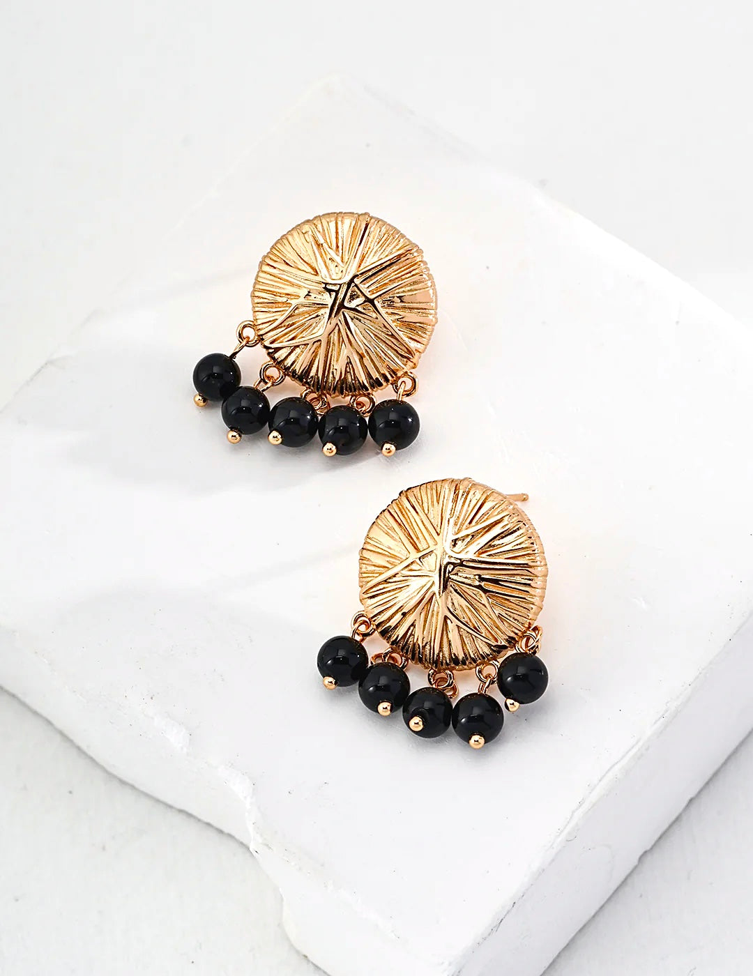 Introducing the Celestial Dusk, a captivating blend of texture and elegance. These earrings feature intricately designed gold discs that evoke celestial patterns, accented by a cascade of polished black agate beads that add a touch of drama.