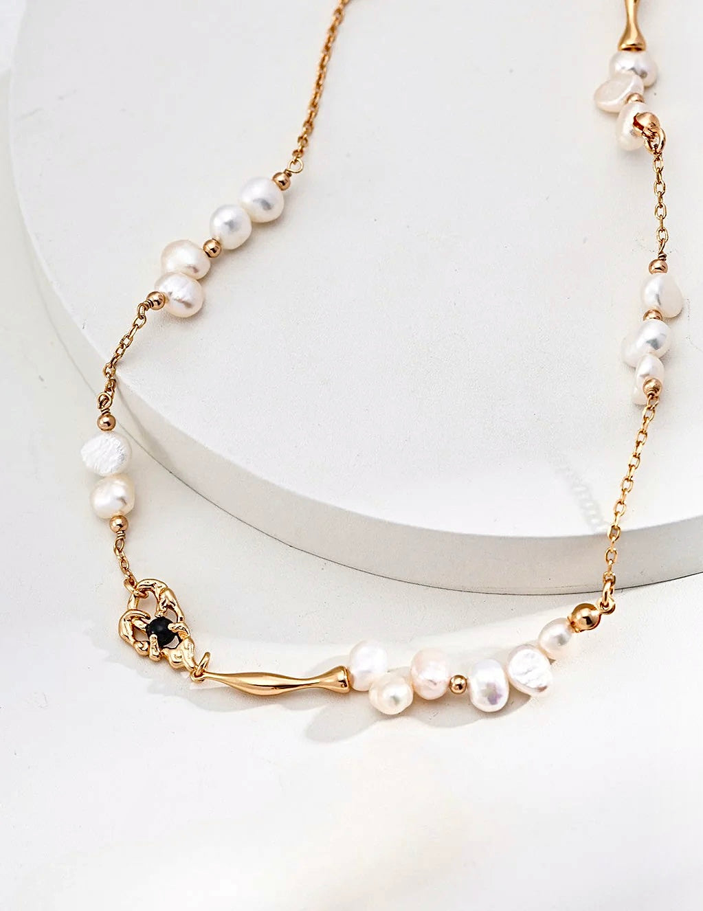 At the center, a uniquely designed gold accent showcases a polished black agate, adding a bold focal point that contrasts beautifully with the surrounding pearls. The gentle curvature of the gold elements echoes organic shapes, enhancing the necklace's fluidity and grace.