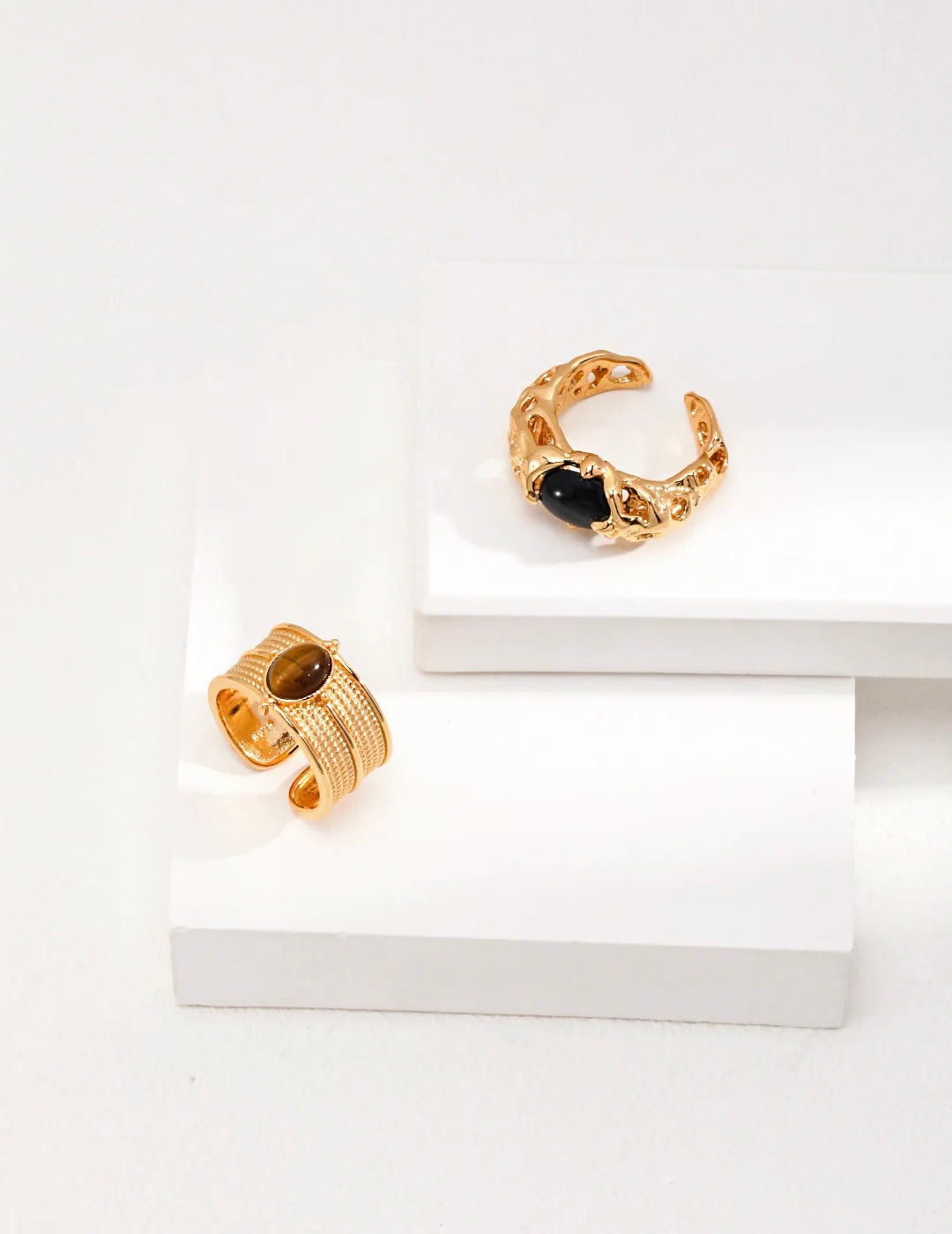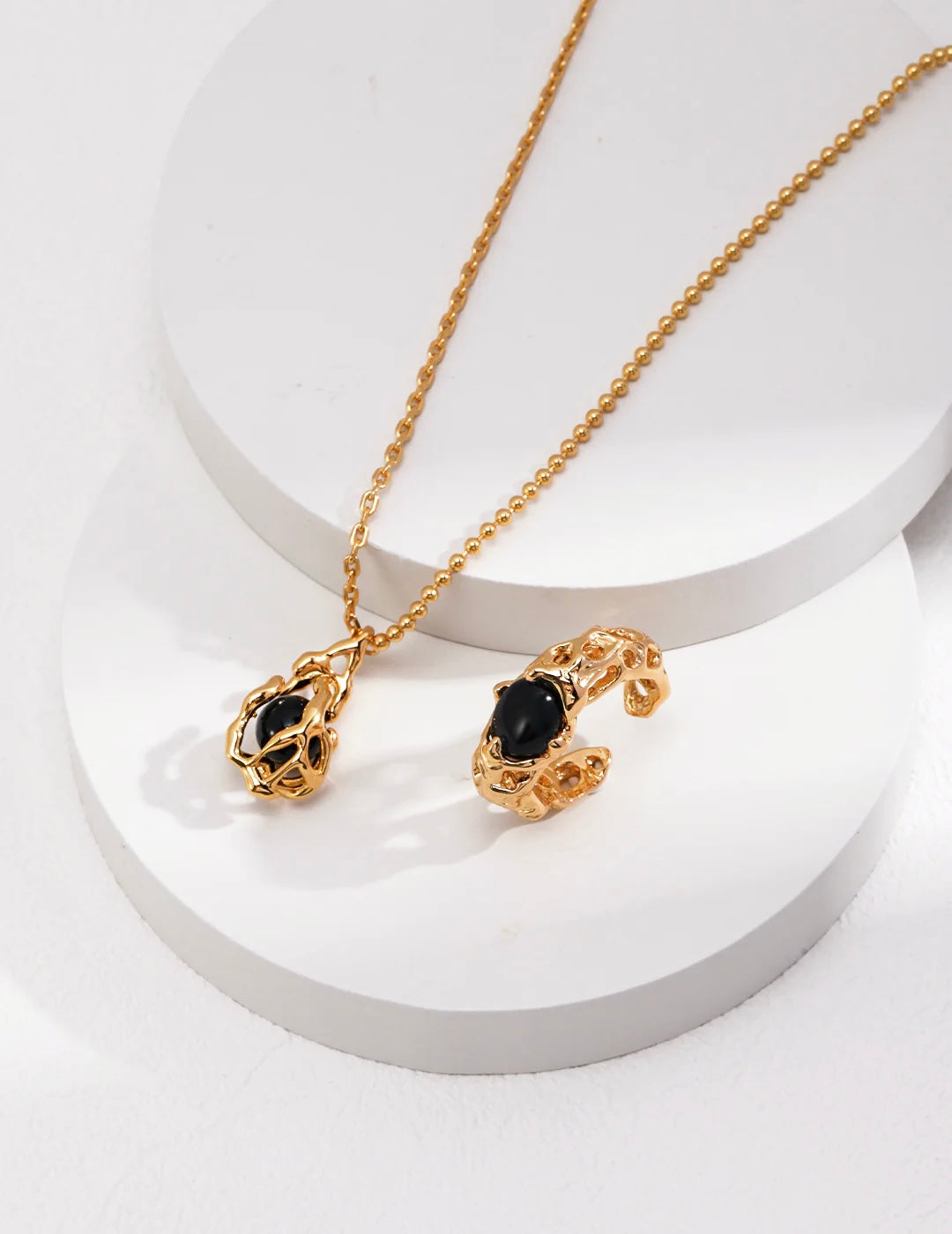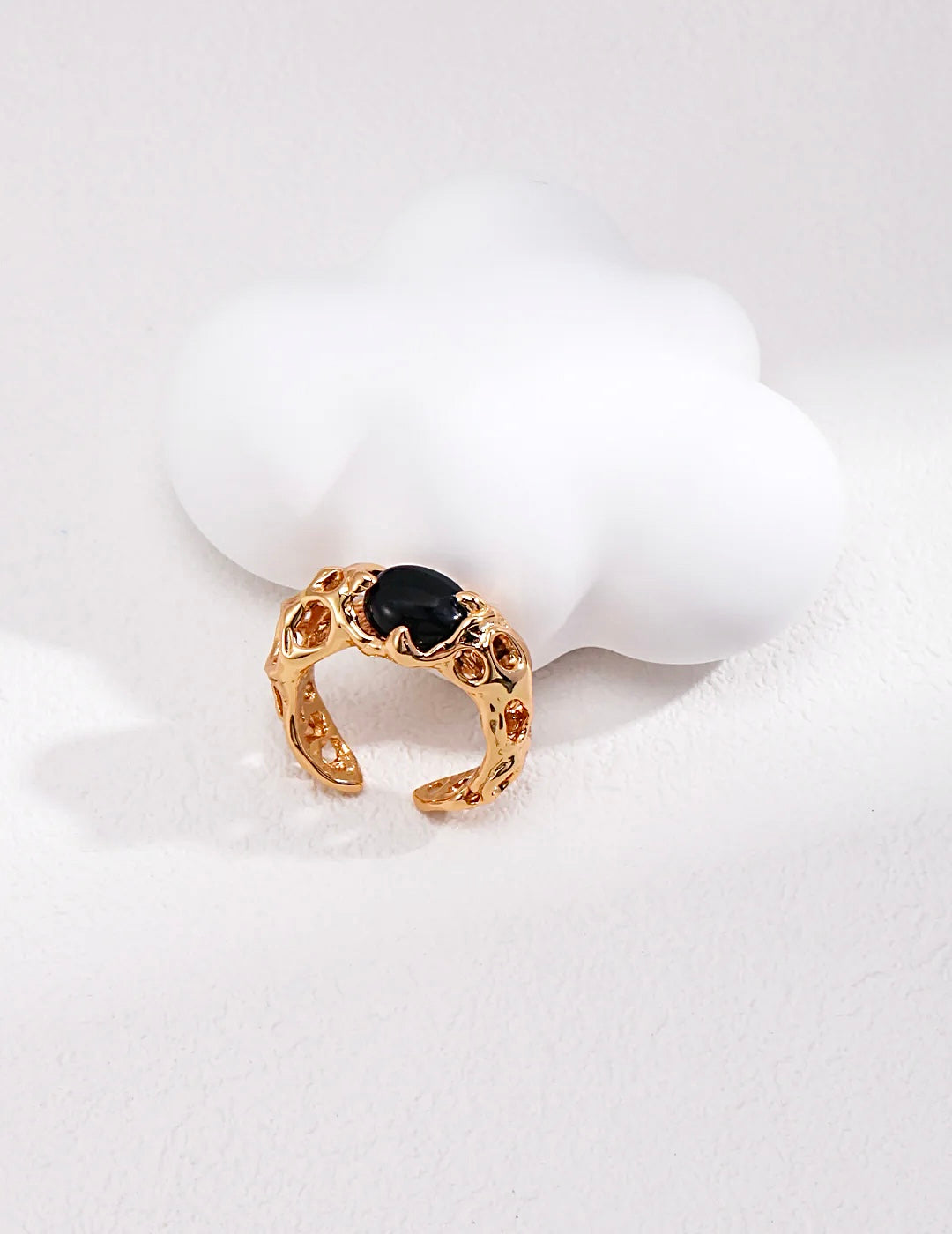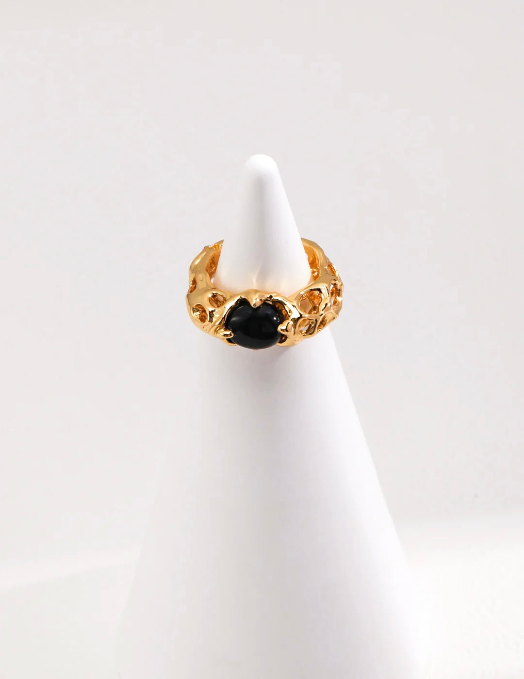 The deep, rich hue of the black agate adds a touch of mystery and sophistication, while the gold detailing enhances the ring's luxurious appeal. The organic shapes and textures create a captivating contrast, drawing attention to the central stone and evoking the beauty of nature.