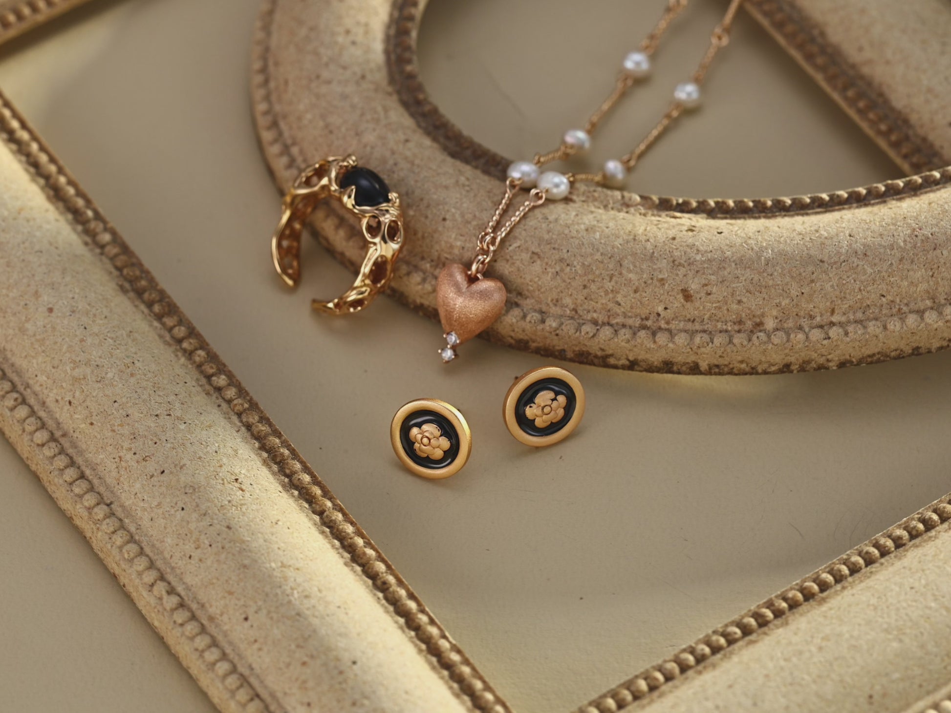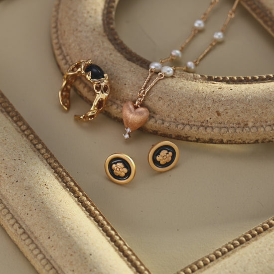 The Eclipse ring is a striking fusion of elegance and bold design, showcasing a stunning black agate stone set within a beautifully crafted gold band. This exquisite piece features intricate floral motifs that wrap around the band, resembling delicate vines and blossoms in full bloom.