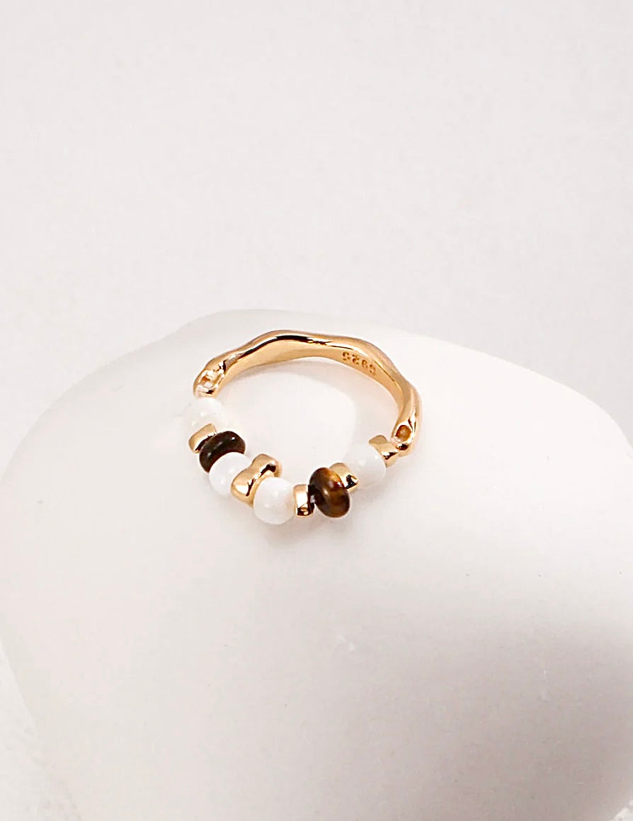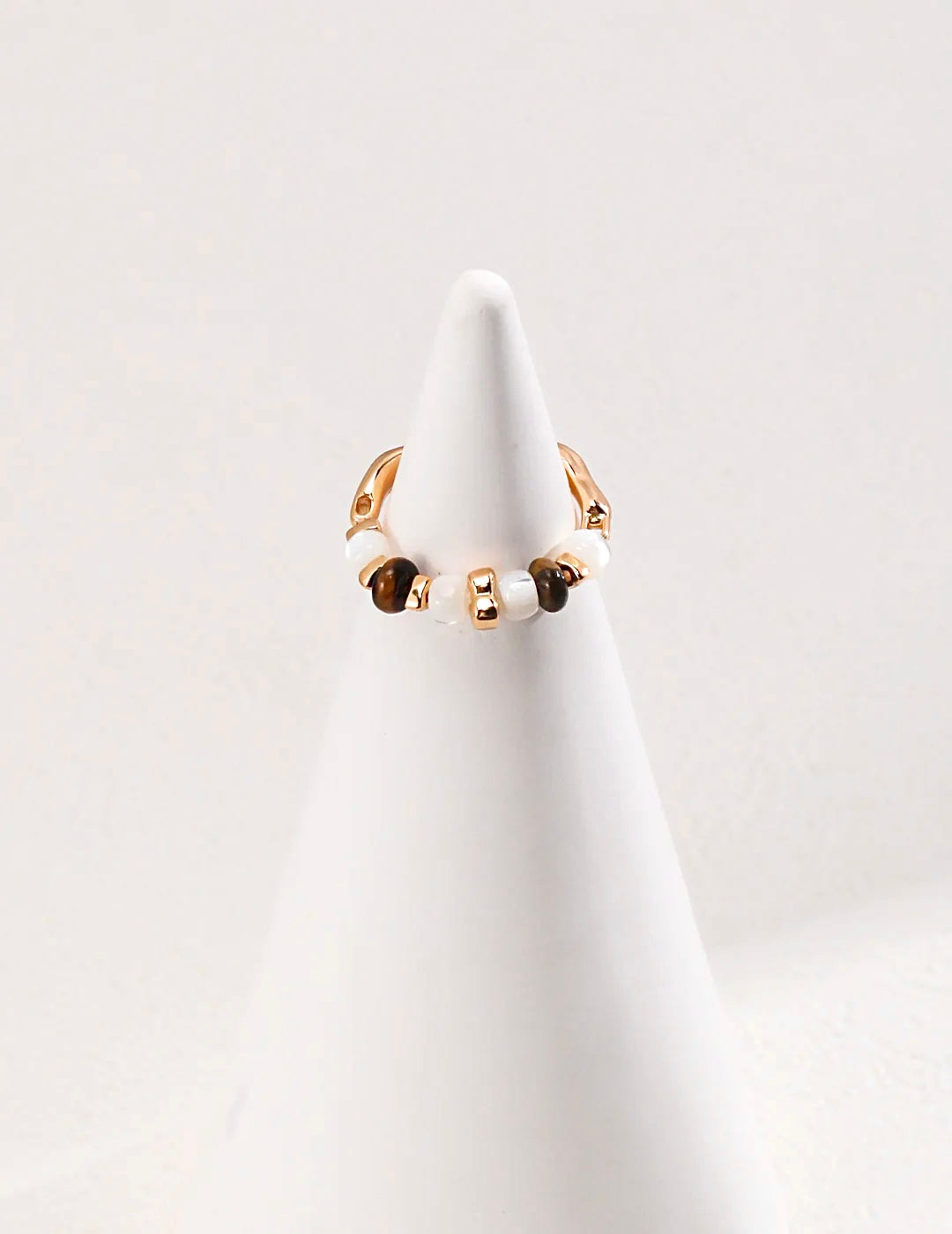 The Nexus is a stunning testament to the beauty of nature, seamlessly blending the rich hues of tiger's eye with the delicate charm of sea shell accents. This exquisite piece features a slender band that elegantly wraps around the finger, crafted in a warm gold finish that enhances the organic allure of the materials.