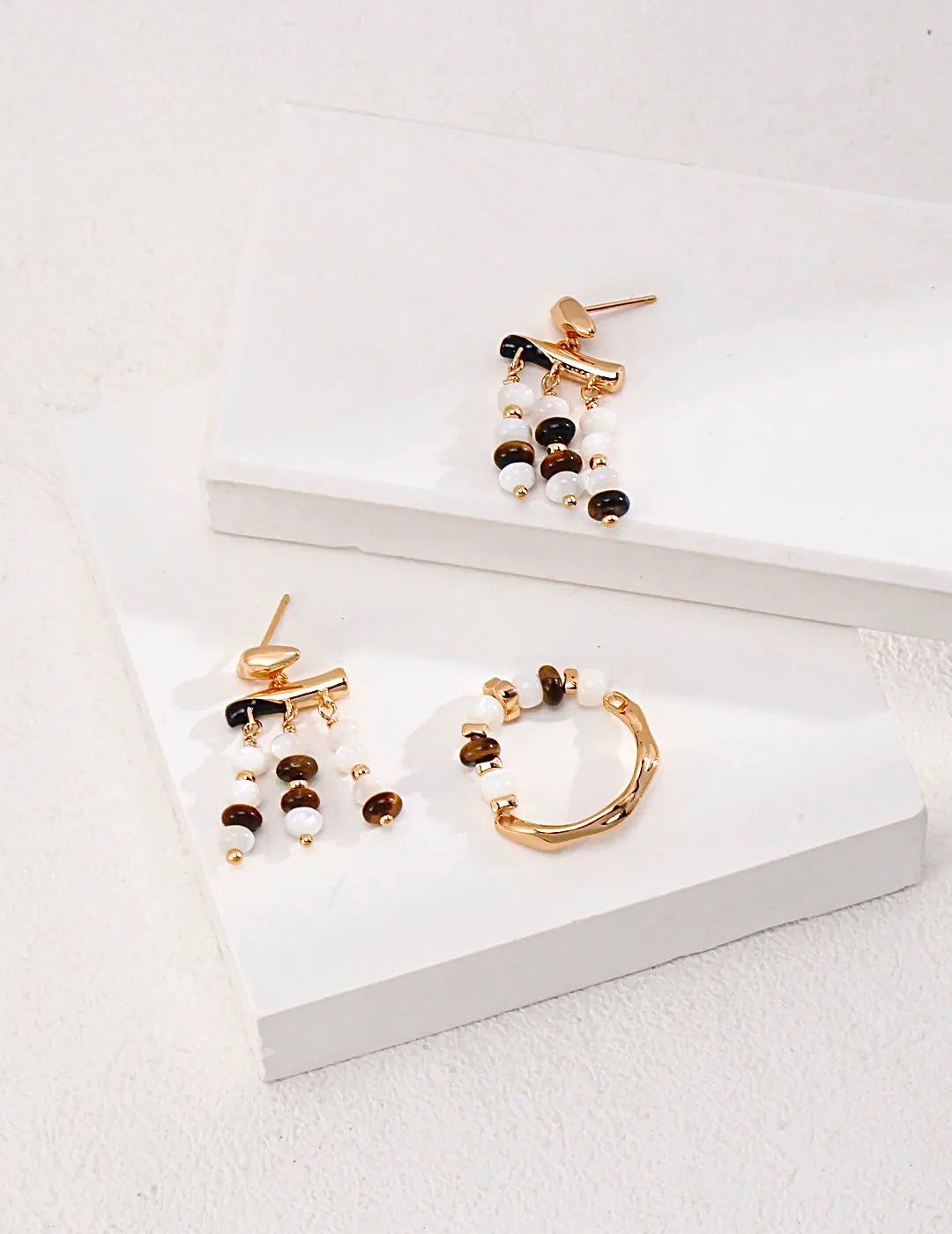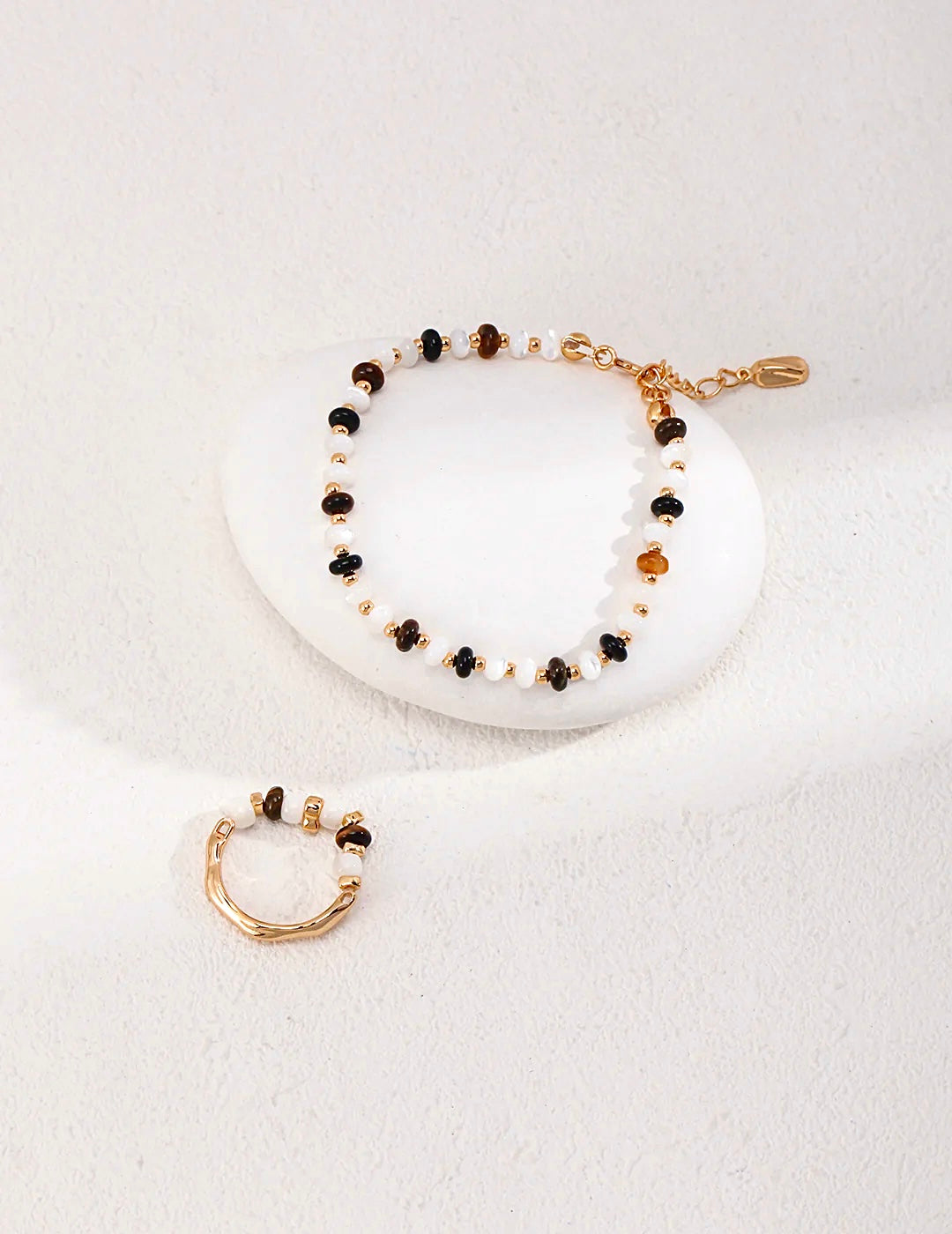 The design showcases a captivating arrangement of alternating tiger's eye and sea shell beads, each thoughtfully positioned to create a rhythmic flow that mimics the gentle ebb and flow of ocean waves. The deep brown and golden stripes of the tiger's eye contrast beautifully with the soft, creamy tones of the sea shells, evoking a sense of tranquility and connection to the sea.