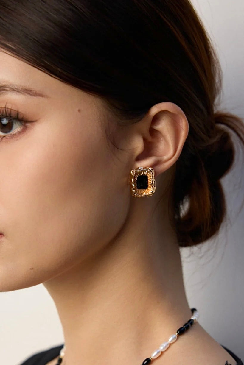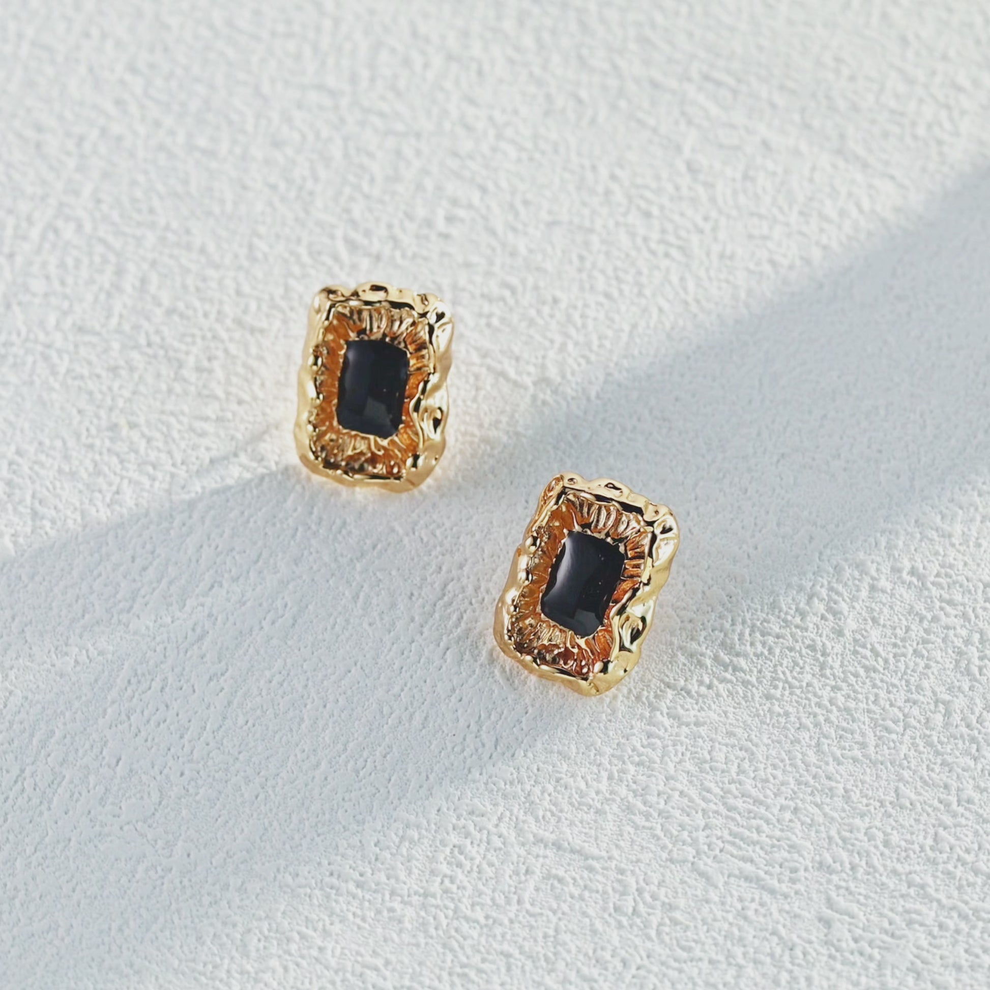 Introducing the Nocturnal earrings, where bold elegance meets artistic flair. These captivating pieces showcase a striking black gemstone nestled within a textured gold frame that mimics the fluidity of nature. The unruly edges evoke the feeling of organic movement, creating a stunning contrast against the polished surface of the stone.