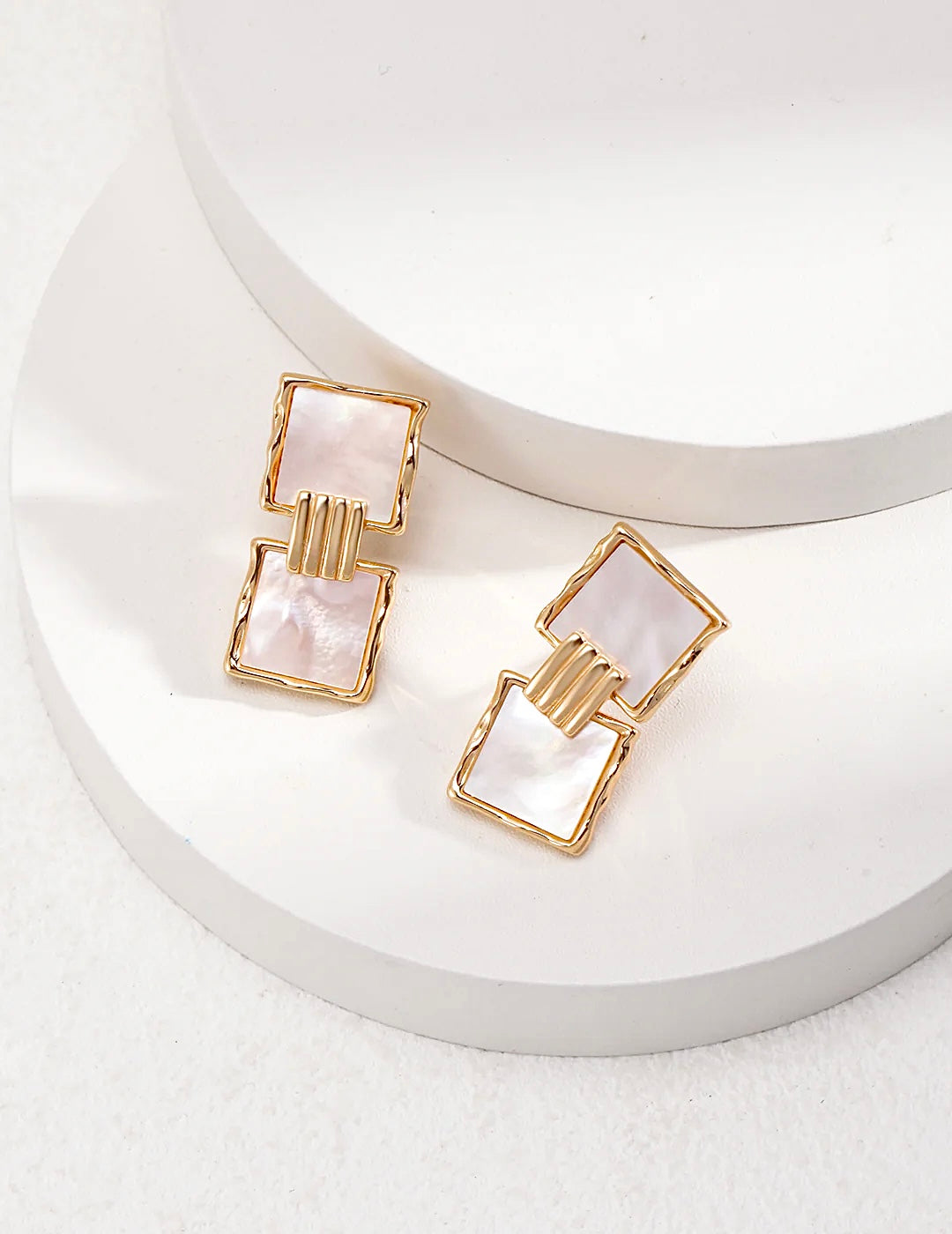 Dive into the elegance of the Prismatic Echoes earrings, where the iridescent charm of mother of pearl is expertly crafted into a modern geometric design. The earrings feature two polished squares, each showcasing the natural shimmer and subtle color variations of the mother of pearl, reminiscent of sunlight dancing on ocean waves.